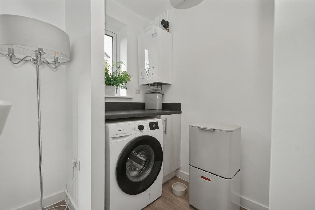 Utility Room: wall mounted combination central heating boiler, plumbed and drained for an automatic washing machine, base level storage cupboard, complimentary working surfaces.