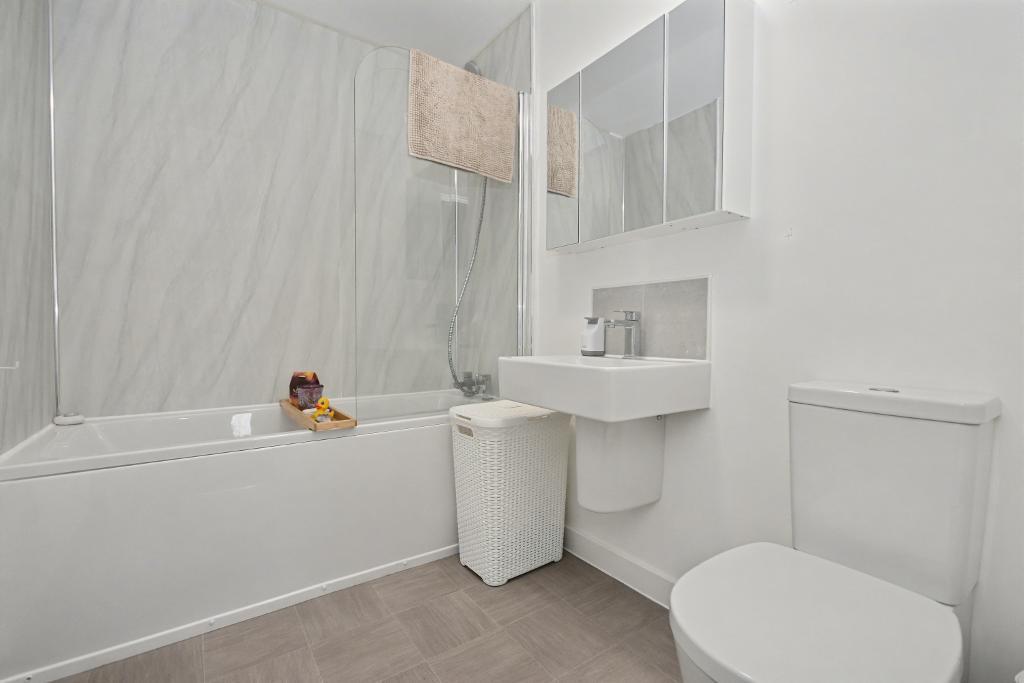 Bathroom: 2.3m x 1.6m (7'7" x 5'4") with a three piece suite in white comprising a low level W.C, wash handbasin, panelled bath with shower mixer tap and vanity screen, extractor fan.