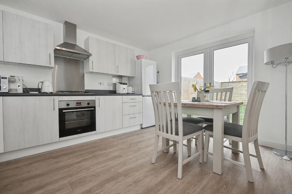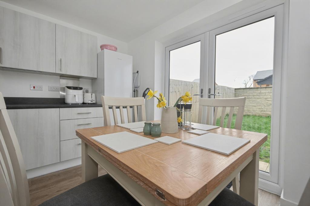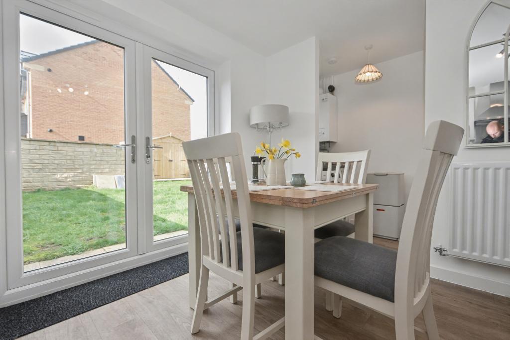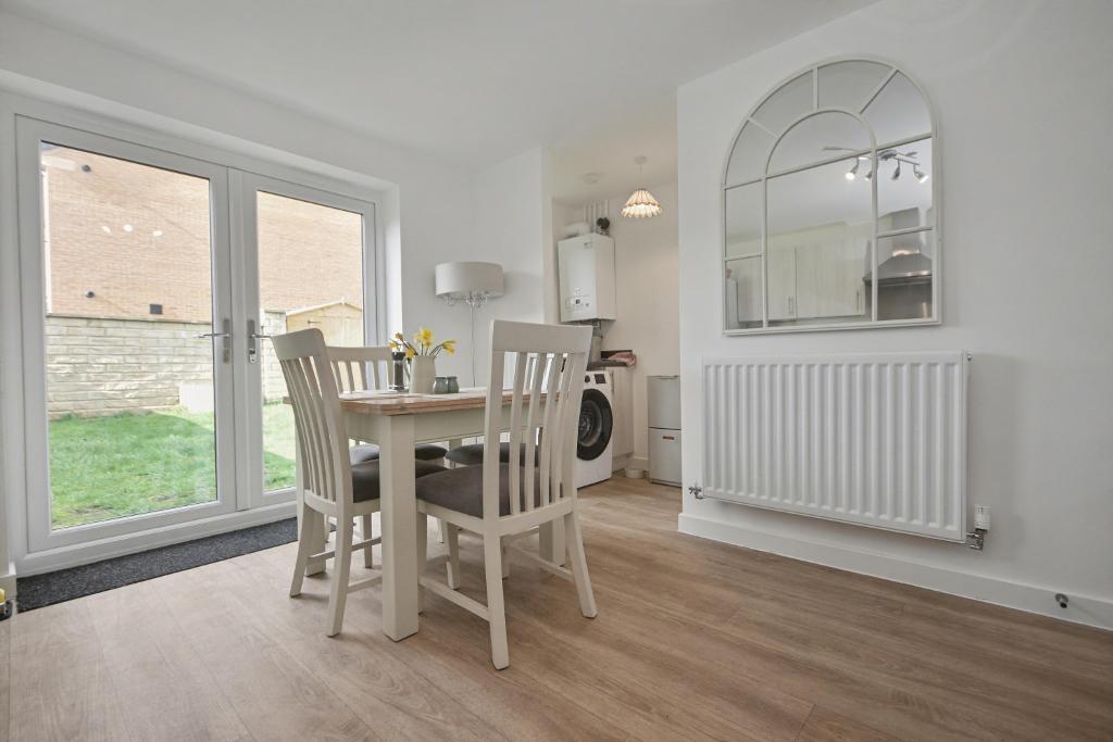 Kitchen Diner: 3.3m x 3.8m (10"9" x 12"4"); with a range of modern fitted base and matching wall storage cupboards with complementary working surfaces, one and a half bowl stainless steel sink unit, built-in electric oven, four ring gas hob with stainless steel splashback and stainless steel extractor fan. Plumbed and drained for an automatic dishwasher, space for fridge freezer, vinyl flooring, UPVC French doors to the rear gardens. Open to: