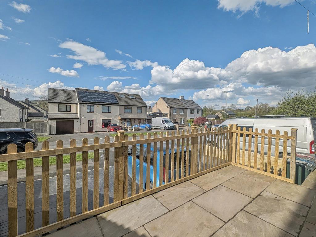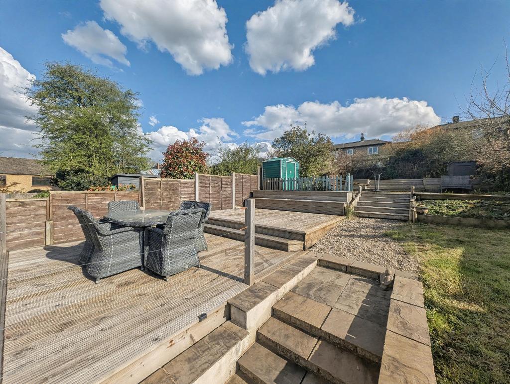 To the front of the property a driveway provides off-road parking for three cars with flagged steps leading up to the property. To the rear of the property is a large tiered and elevated garden space with separate decked patio areas, stone steps, pebbled pathways, lawned sections and a timber storage shed. The gardens enjoy views over the house and the surrounding area.