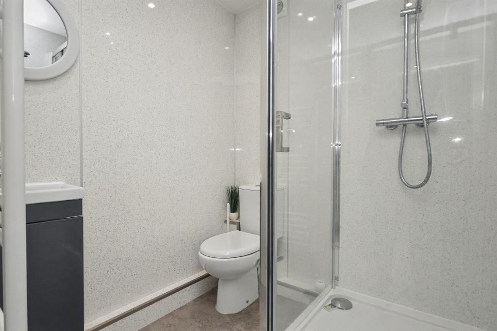Shower Room: 1.8m x 1.7m (5"10" x 5"8"); with a 3-piece suite in white comprising low level W.C, pedestal wash handbasin and a corner shower enclosure with plumbed shower, low voltage lighting, extractor fan.