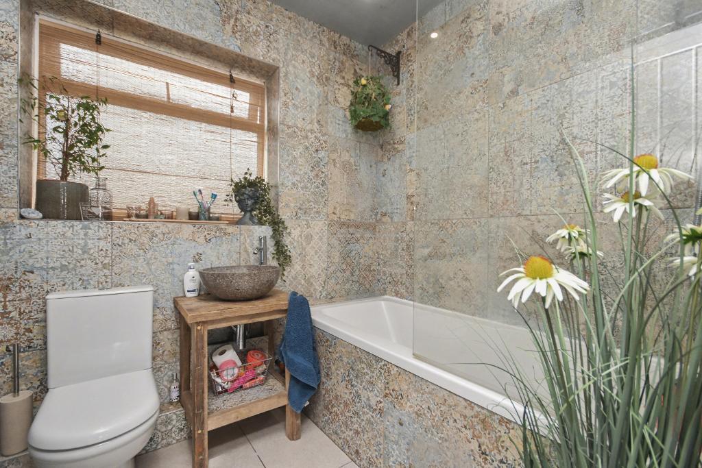 Bathroom: 2.0m x 1.8m (6'6" x 5'11"); with a 3-piece contemporary suite with a low level W.C, stone effect vanity sink and a panelled bath with plumbed shower over and vanity screen. Built-in storage cupboards housing combination central heating boiler, tiled flooring, fully tiled walls, low voltage lighting, extractor fan, heated stainless steel towel rail.