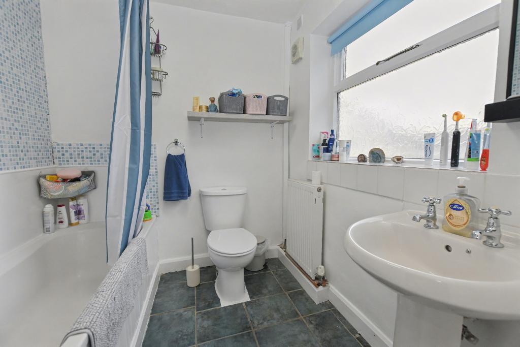 Bathroom: with a three-piece white suite comprising low suite W.C with push button flush, pedestal wash hand basin with chrome taps, panelled bath with chrome taps and mixer shower over, part-tiled walls, extractor fan and tiled floor.