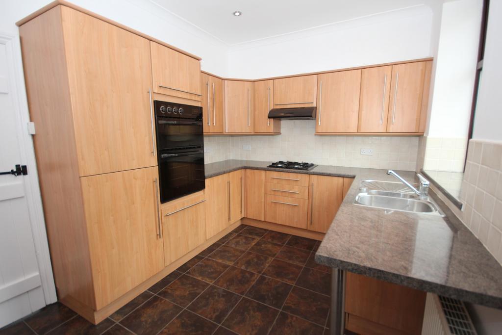 KITCHEN: 3.6m x 2.7m (11'9" x 8'9"); modern range of fitted wall and base units with complementary laminate working surfaces, integrated electric double oven and 4-ring gas hob with extractor filter canopy over, plumbing for washing machine, understairs store cupboard, staircase to first floor, PVC rear external door..