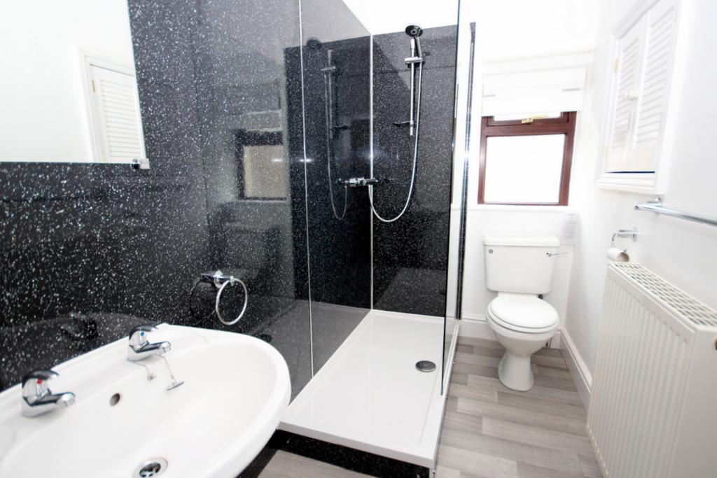 SHOWER ROOM: Modern 3-pce white suite, comprising walk-in double shower enclosure with thermostatic shower, low suite w.c. and pedestal wash basin.