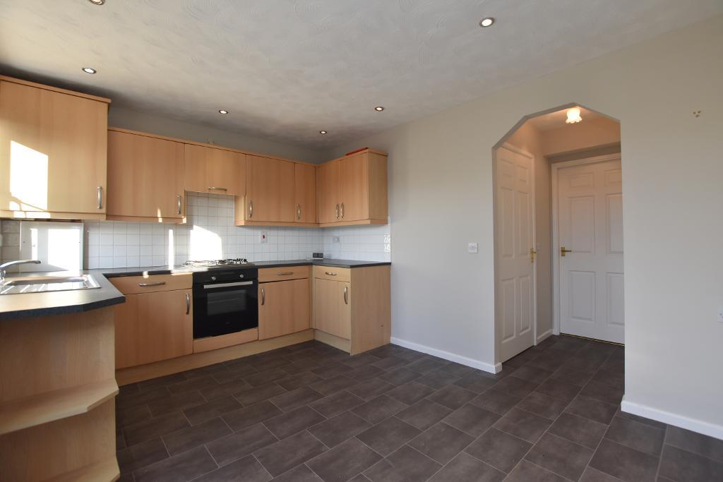 Dining kitchen: 4.0m x 3.1m (13'3" x 10'2"); with a range of modern fitted base and matching wall storage cupboards with complementary working surfaces, built-in electric oven, 4-ring gas hob with stainless steel extractor over, single drainer stainless steel sink unit, wall-mounted combination central heating boiler, plumbed and drained for an automatic washing machine, partially tiled walls, PVC patio doors to the rear garden and additional built-in storage cupboards.