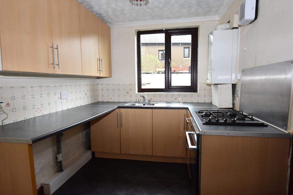 KITCHEN: With range of fitted wall and base units with complementary working surfaces, built-in electric oven and four-ring gas hob.