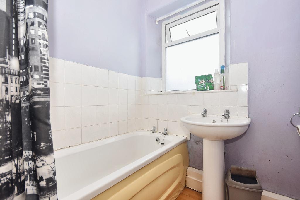 Bathroom: 3-piece suite comprising a low level w.c., pedestal handwash basin and a panelled bath with electric shower over, part-tiled walls.