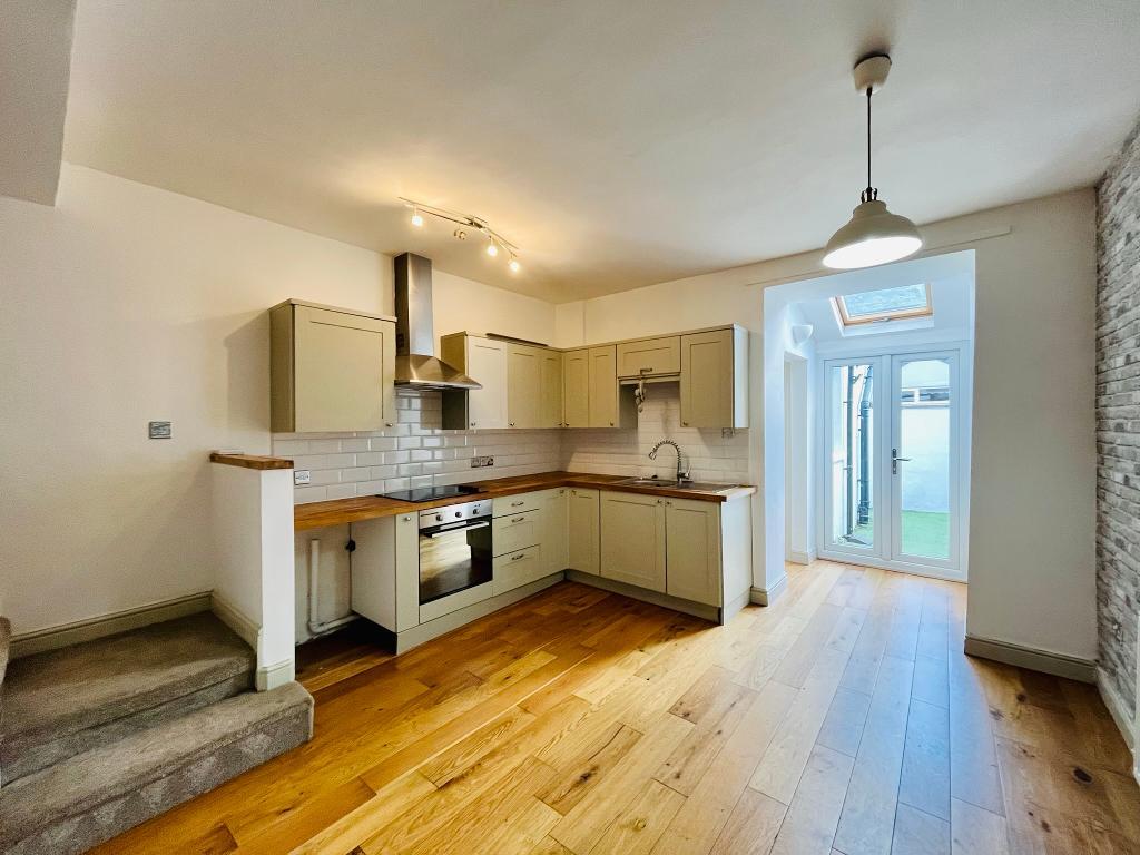 Dining kitchen: 6.1m narrowing to 4.5m x 3.8m (20' narrowing to 14"72 x 12'4"); with a range of attractive fitted wall and base units with solid wood working surfaces, integrated electric oven, 4-ring ceramic hob with extractor over, plumbing for washing machine, staircase to first floor, French doors to the rear.