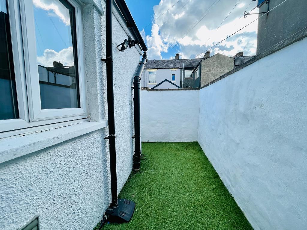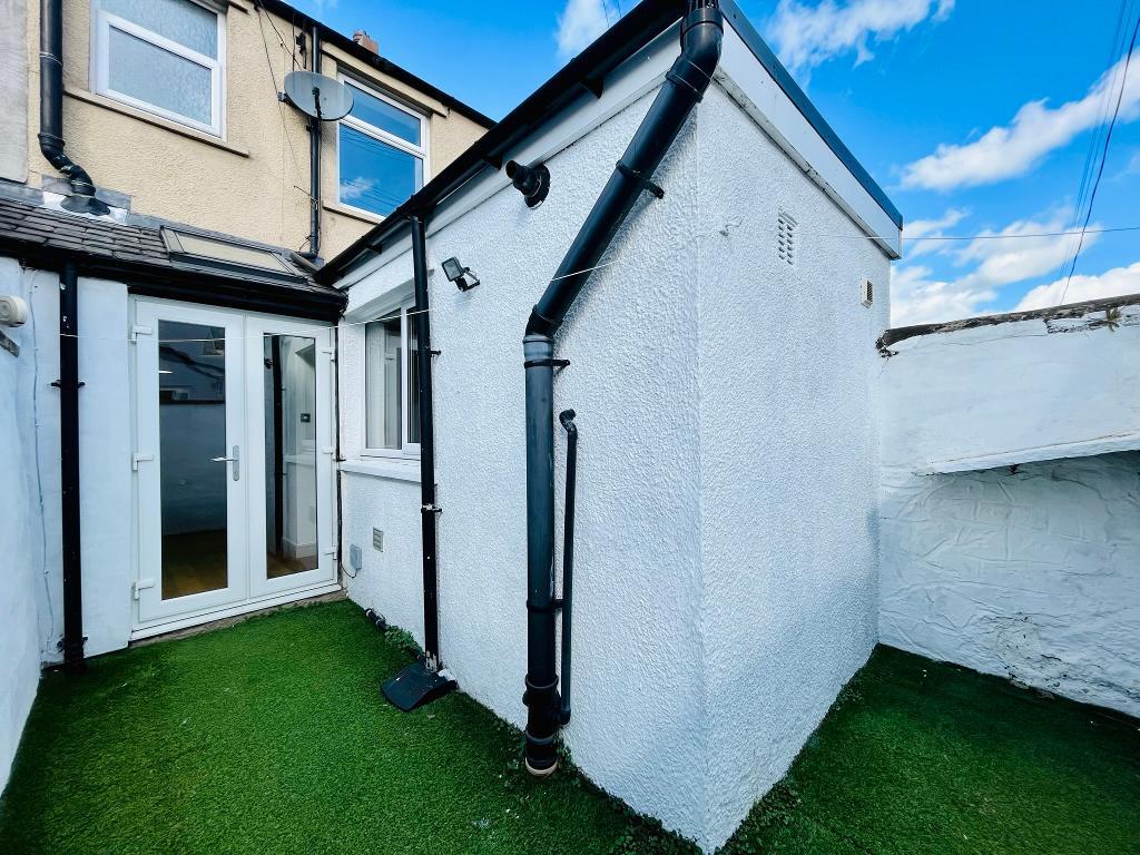 Enclosed rear yard with artificial lawn, bin storage area and gate to rear.