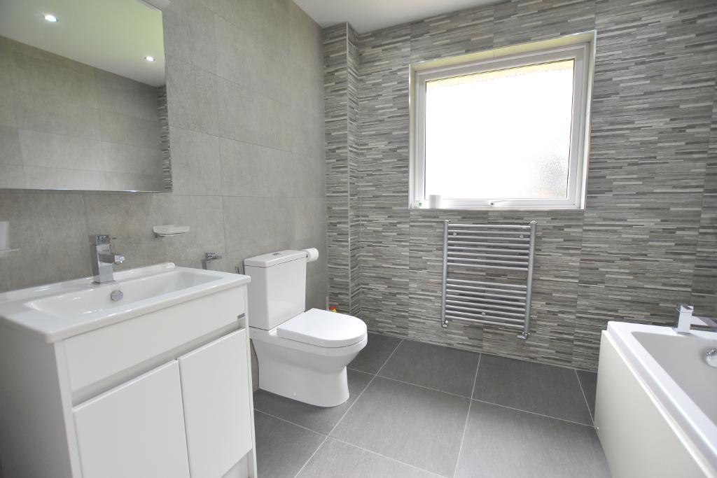 House bathroom: Housing modern three-piece white suite comprising low suite w.c, vanity washbasin, panelled bath with chrome mixer tap and thermostatic shower over, glass shower screen and heated ladder style towel rail.