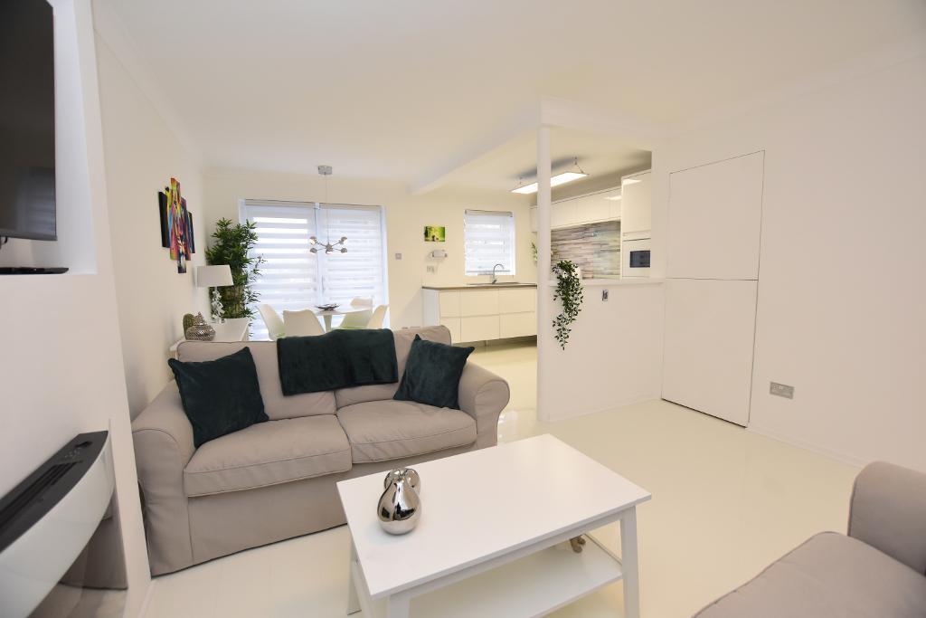 Dining Kitchen: 4.7m x 2.9m (15"6" x 9"8"); an open-plan bright space with fitted contemporary white gloss kitchen with white gloss laminate work surface, stainless steel single drainer sink unit with mixer tap, integrated electric fan oven with 4-ring gas hob and extractor over, integrated Bosch microwave, integrated fridge with freezer compartment, coved cornicing, gloss white laminate flooring, space for dining table and chairs, fitted blinds and glazed PVC French doors opening onto decked patio area.