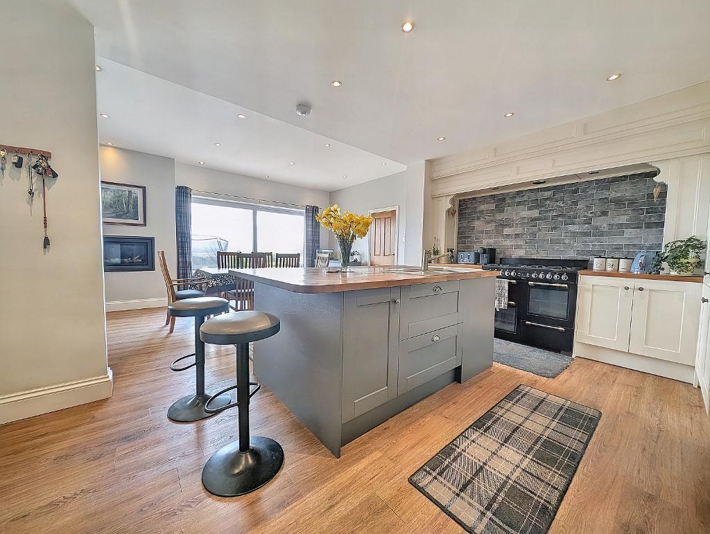 Kitchen: 5.1m x 3.4m (16'10" x 11'3"); With a range of modern fitted base and matching wall storage cupboards and matching centre island with solid wood working surfaces, one-and-a-half bowl stainless steel sink unit with mixer tap and a range of built-in appliances including a range style oven with 7 gas burners, dual ovens and plate warmer, built-in combination microwave, built-in dishwasher, built-in fridge-freezer, wine cooler, extractor hood, breakfast bar, part-tiled walls, laminate wood-effect flooring and low voltage lighting.