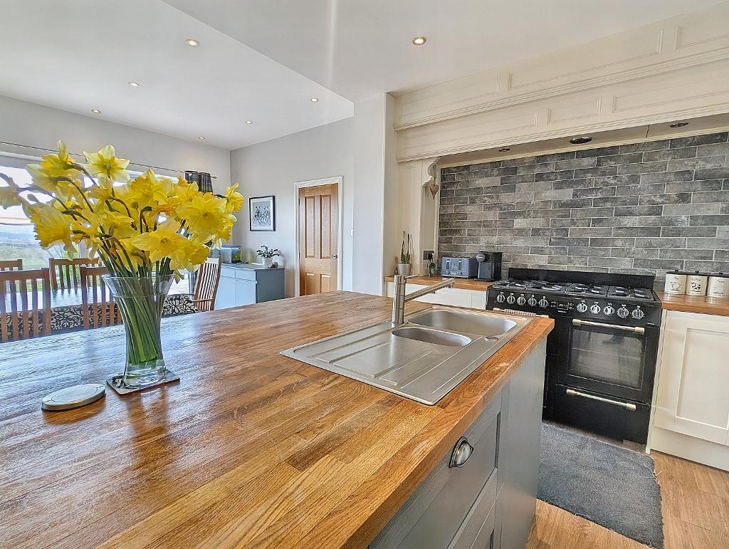 The highlight of property is the bright and airy open-plan living kitchen area which offers a stunning fitted kitchen, centre island and two sets of patio doors which overlook the rear gardens with distant views beyond. The property benefits from a spacious but cosy separate living room and conservatory, along with a large utility, cloakroom, ground floor double bedroom and shower room. On the first floor are three further double bedrooms, with the master being of exceptional size and enjoying an adjoining storeroom (which has potential to be used as a dressing room) and an en-suite shower room, along with the separate main house bathroom.