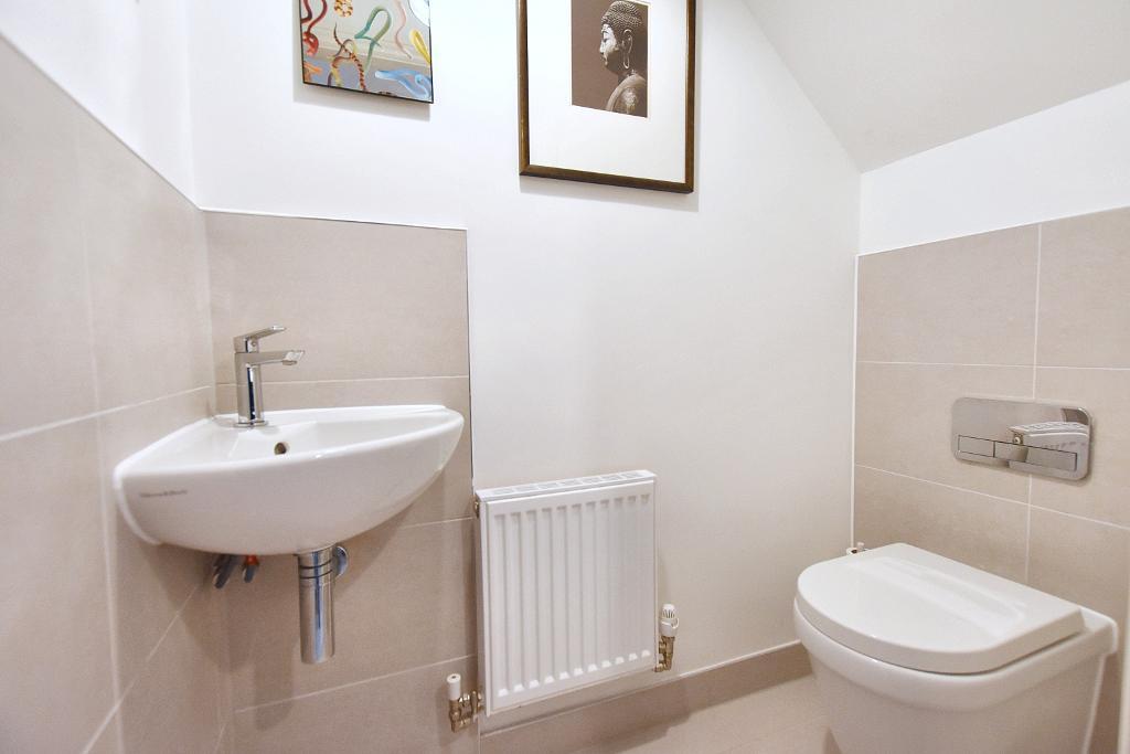 Cloakroom: 2-piece Villeroy & Boch suite with low suite w.c. with concealed cistern and chrome flush plate, corner wall-hung wash-hand basin with chrome mixer tap, part-tiled walls and tiled floor.
