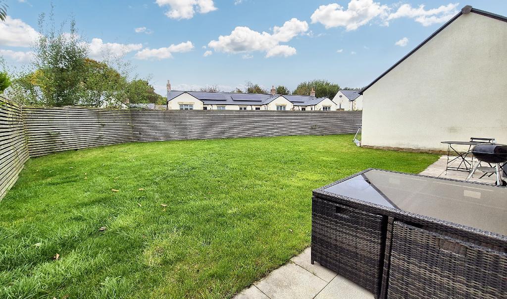 The property has a front garden with feature estate railing, central pathway to front door with lawn to either side. To the side is a large driveway providing parking for 4 cars leading to a DETACHED DOUBLE GARAGE measuring 6.1m x 5.7m (19"11" x 18"8") with 2 single up-and-over doors, power and light and loft storage. Gated access leads to an enclosed west-facing rear garden with patio areas, lawn, outside lighting and boundary fencing.