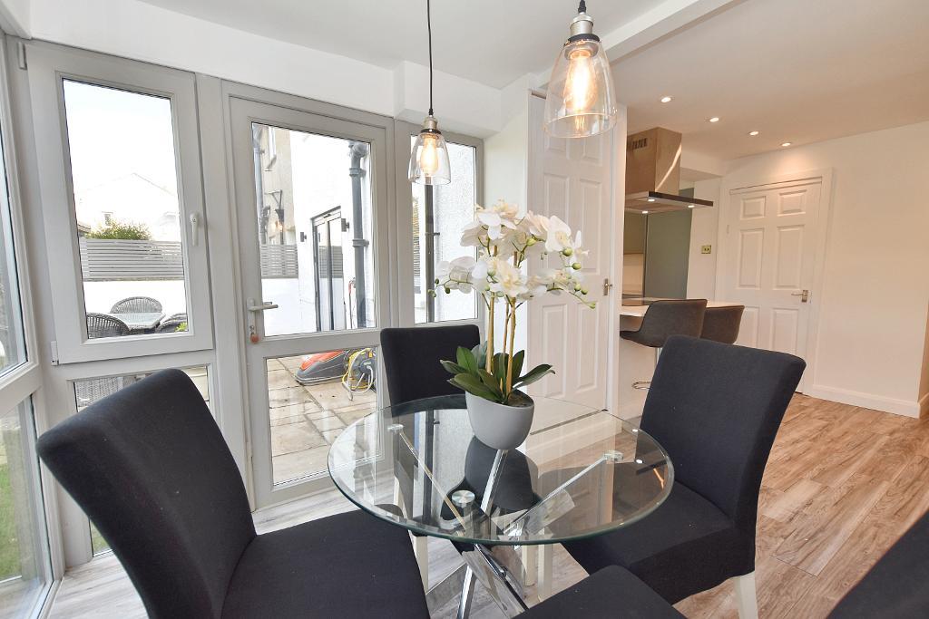 Dining Area: 2.2m x 5.2m (7"4" x 17"1"); with glazed picture window and glazed door opening onto rear garden, space for dining table and chairs, built-in storage cupboard, PVC door leading to front driveway and cloaks storage area.