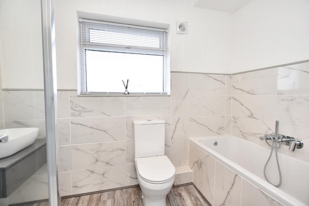 Cloakroom: Modern 2-piece suite comprising low-suite w.c. with push button flush and wash-hand basin with chrome mixer tap, extractor fan and understairs storage.