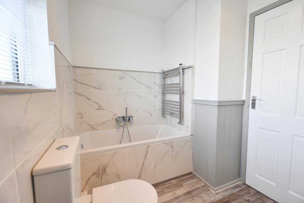 Bathroom: Modern 4-piece suite comprising low suite w.c., wall-hung vanity wash-hand basin with chrome mixer tap and storage drawer below, panelled bath with wall-mounted chrome shower-tap fitment, fitted shower enclosure with thermostatic shower, part-tiled walls and chrome heated ladder style towel rail.