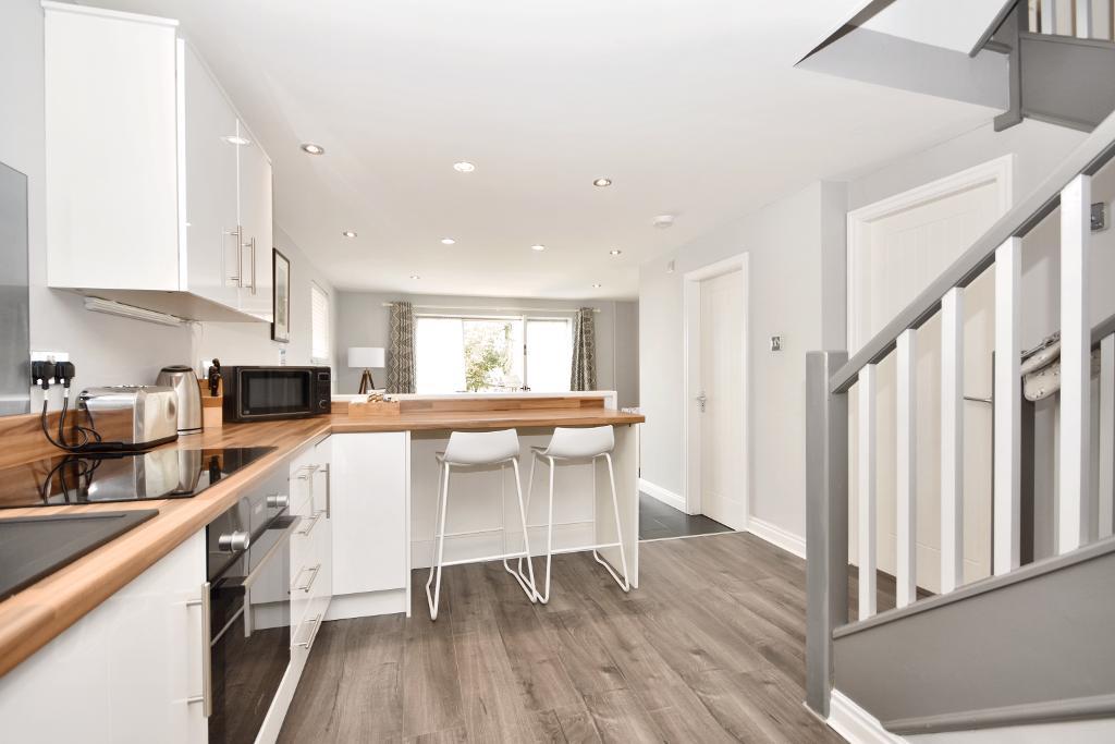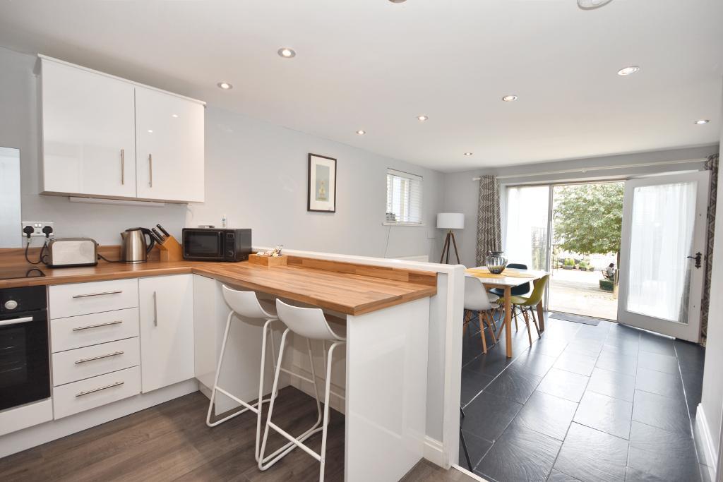 Kitchen: 3.2m x 3.9m (10"4" x 12"8"); with a range of fitted base and matching wall storage cupboards with complementary work surfaces, breakfast bar, built-in electric oven, 4-ring induction hob, single drainer sink unit, plumbed and drained for an automatic dishwasher or washing machine and laminate wood effect flooring.