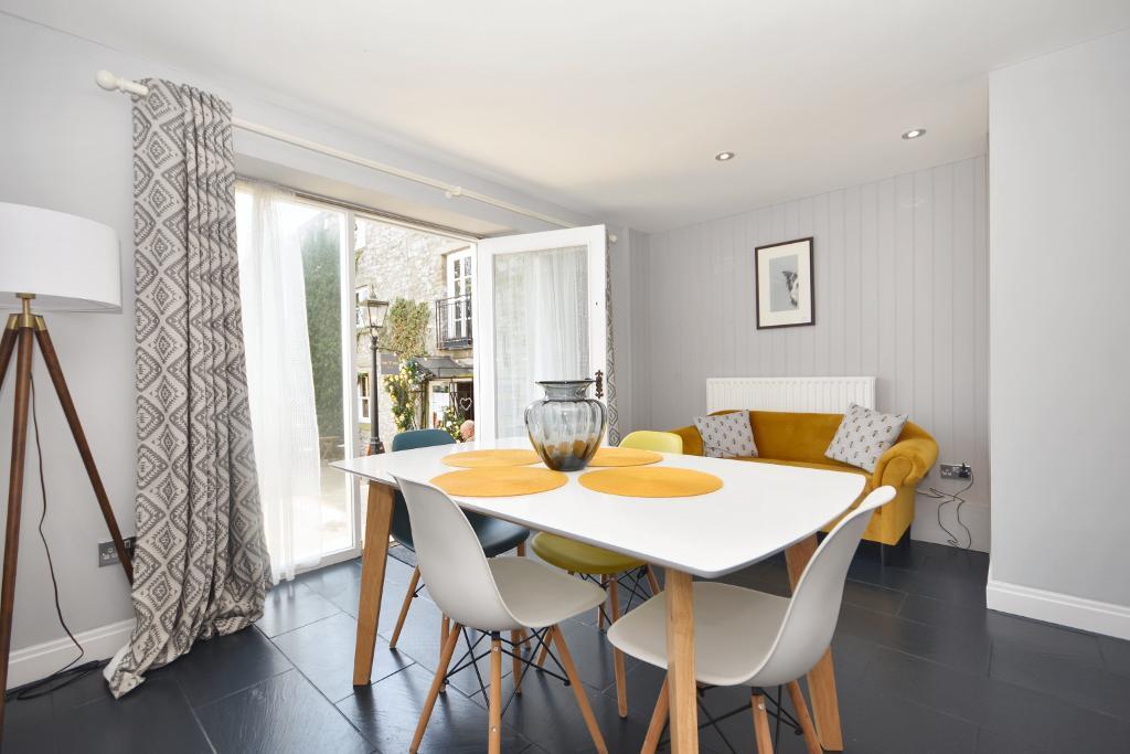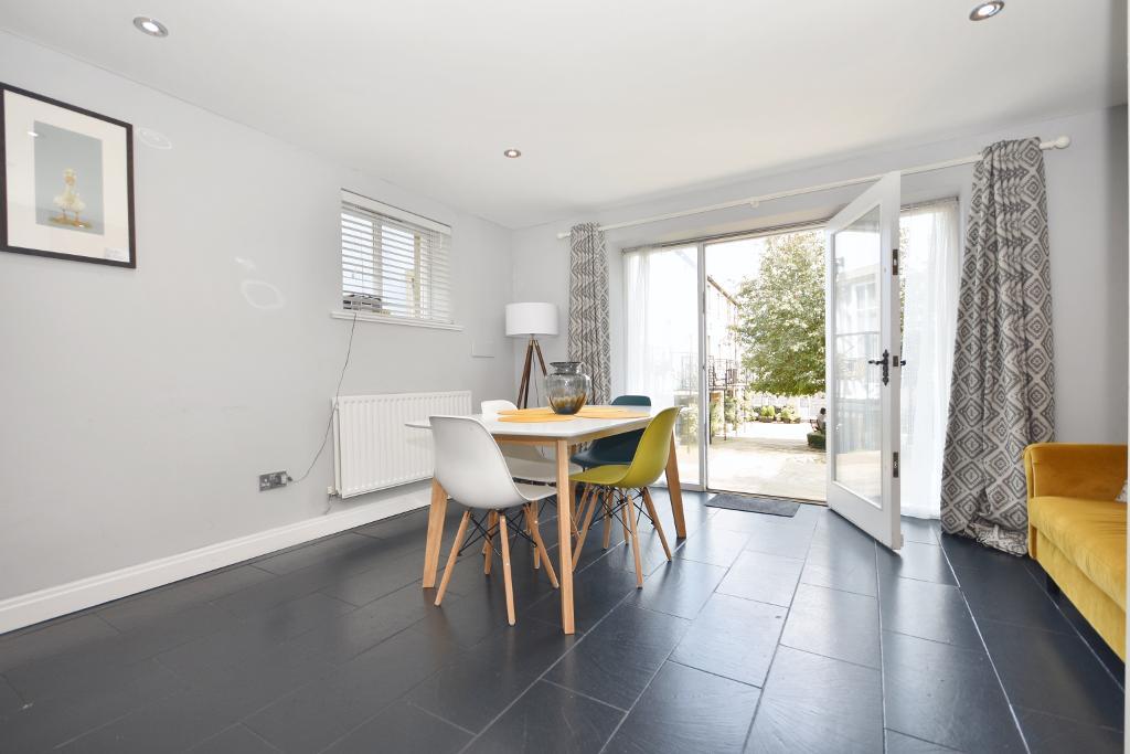 Dining Room: 4.4m x 4.0m (14"4" x 13"1"); with glazed external doors and tiled flooring.