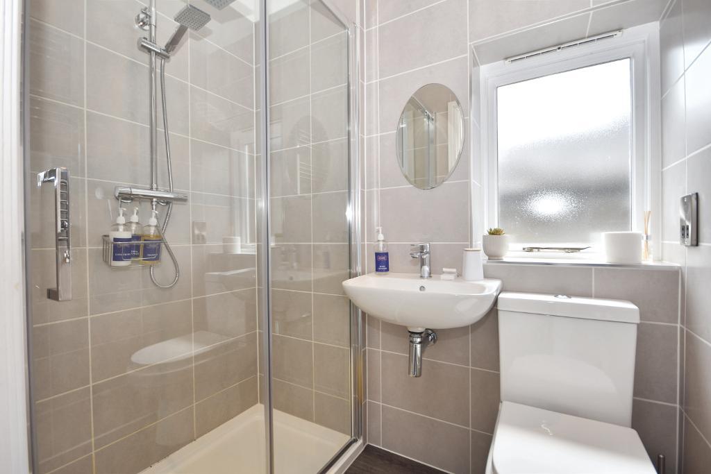 Shower room: 3-piece suite in white comprising a low level w.c., vanity wash-hand basin and a corner shower enclosure with plumbed shower, majority tiled walls, heated stainless steel towel rail, extractor fan and vaulted ceiling.