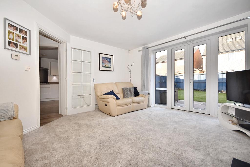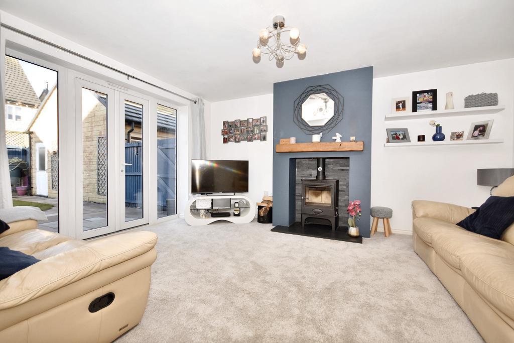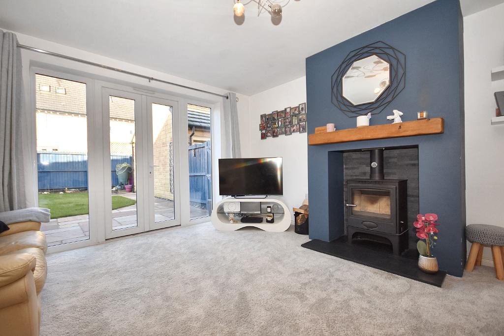 Living room: 4.1m x 4.5m (13'7" x 14'8"); with UPVC patio doors to the rear garden, multi-fuel burner in feature surround with wooden mantel over, telephone point and television point.