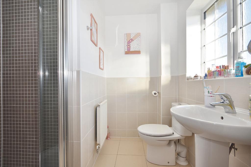 En-suite shower room: 3-piece suite in white comprising a low level w.c., pedestal wash-hand basin, corner shower enclosure with plumbed shower, extractor fan, fully tiled walls and tiled floor.