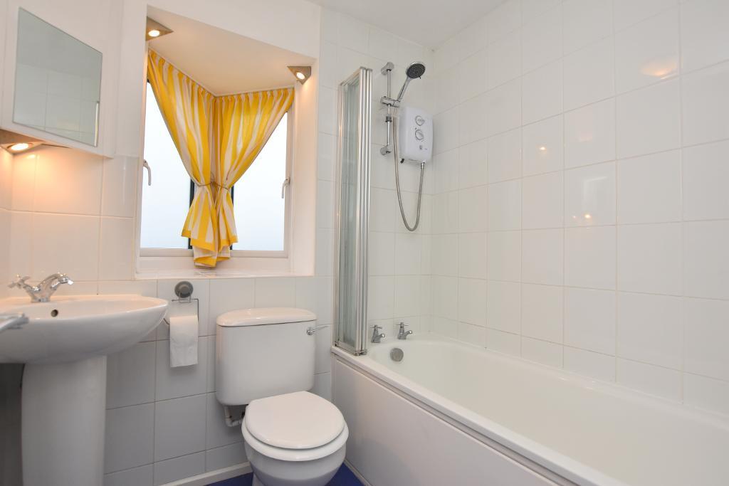 Bathroom: 3 piece suite in white comprising a low level wc, pedestal handwash basin, panelled bath with electric shower, partially tiled walls, vanity cupboard and heated towel rail.