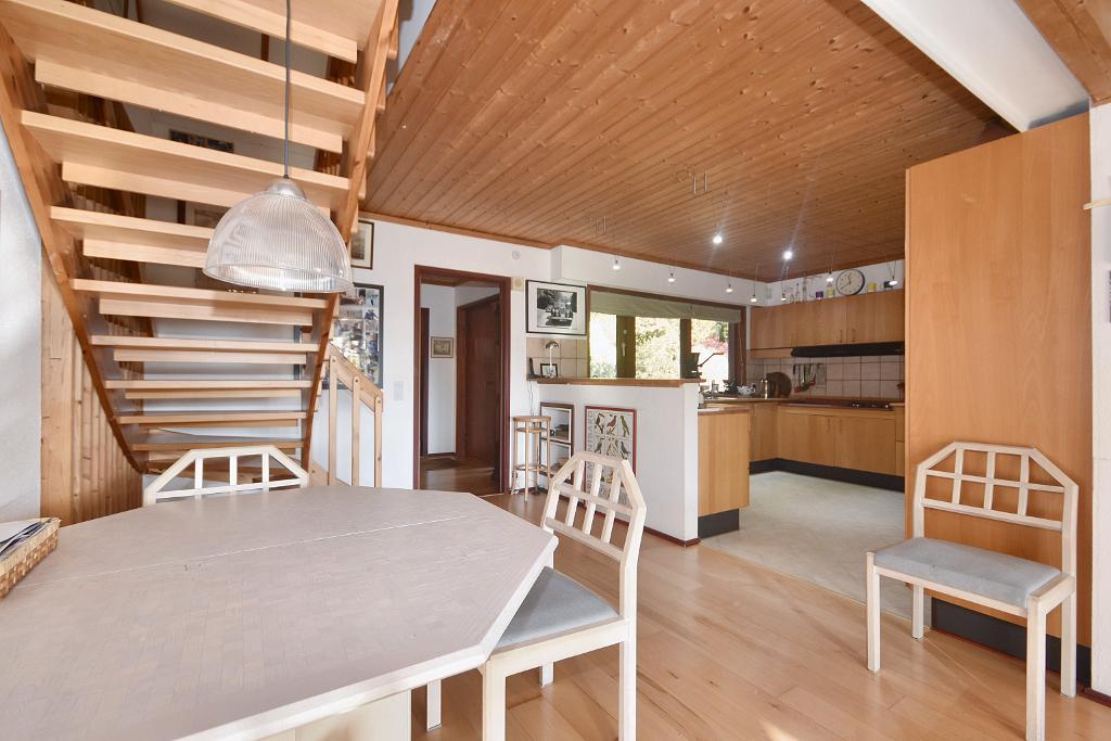 Kitchen & Dining Area: 3.6m x 6.6m (11"11" x 21"7"); Kitchen area with a range of fitted base and matching wall storage cupboards with solid wood working surfaces, one-and-a-half bowl stainless steel sink unit, range of built-in appliances including separate fridge and freezer, electric oven, microwave, 2 ring gas hob and 2 ring electric hob with extractor hoods over and part-tiled walls. Dining Area with open tread timber staircase to the first floor.