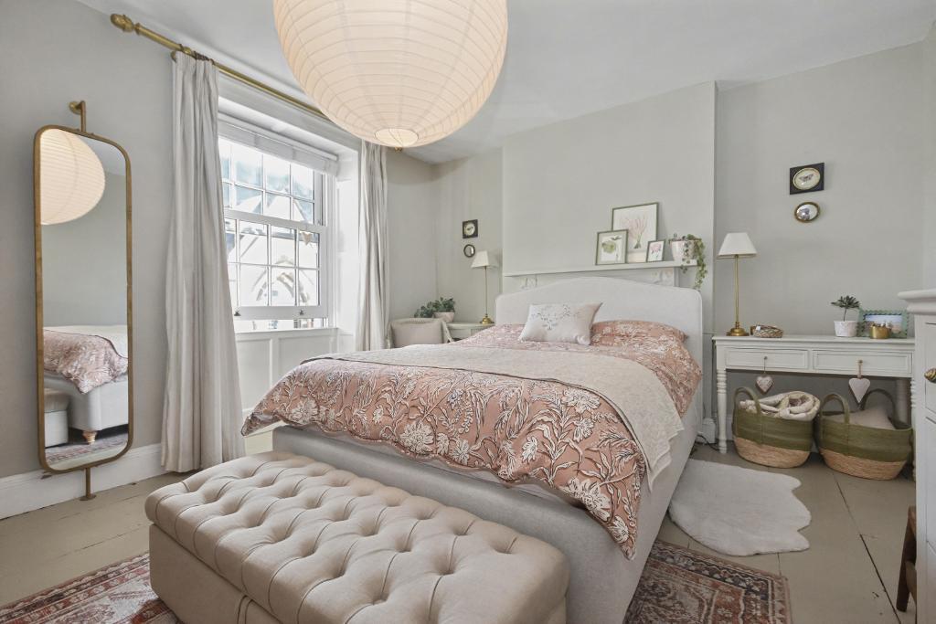 Bedroom One: 4.5m x 3.5m (14'7" x 11'4") with boarded wooden flooring, feature bay window.