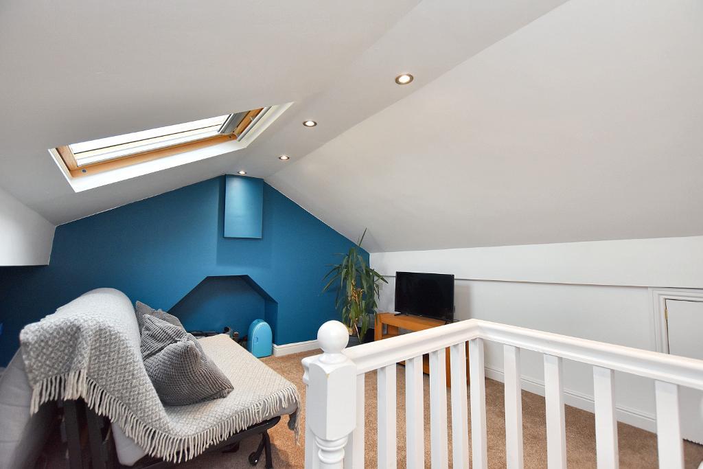 Attic room: 3.8m x 3.9m (12"5" x 12"9"); with Velux window and eaves storage.
