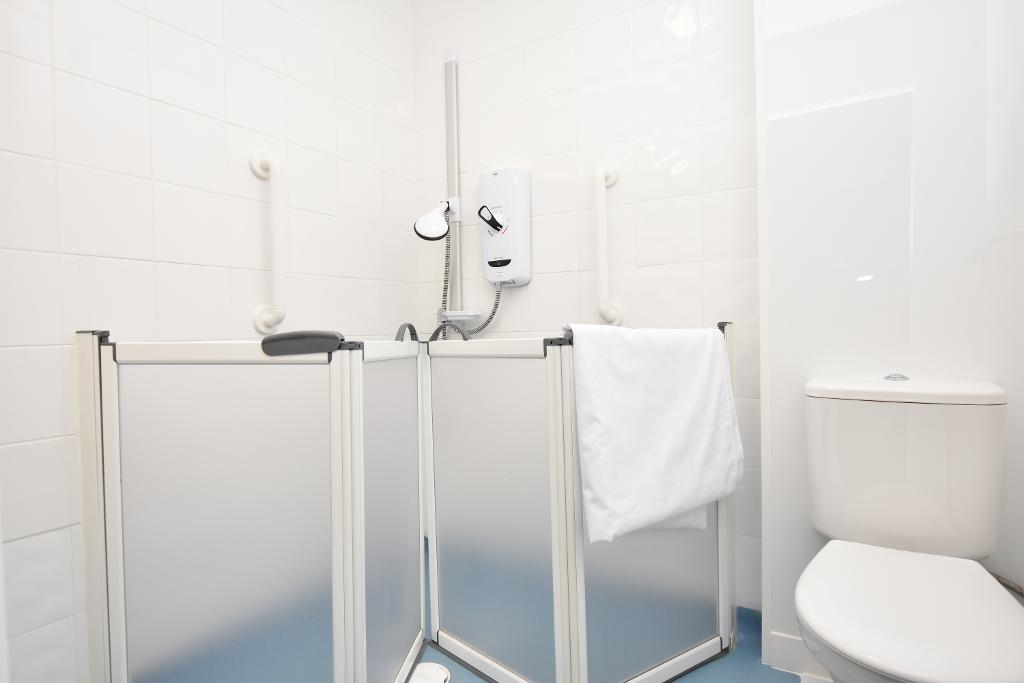 Shower room: 3-piece wet room comprising low suite w.c., pedestal washbasin and accessible shower area with folding screen and wall-mounted electric shower.