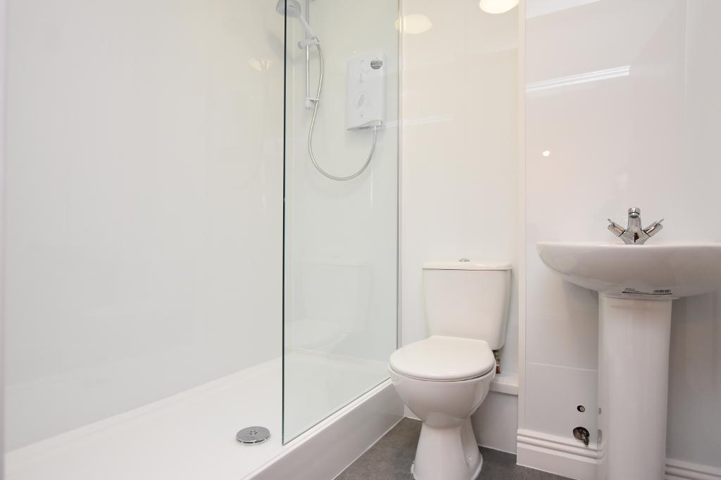 Shower room: Housing 3-piece suite comprising low suite w.c., pedestal washbasin and shower enclosure with electric shower.