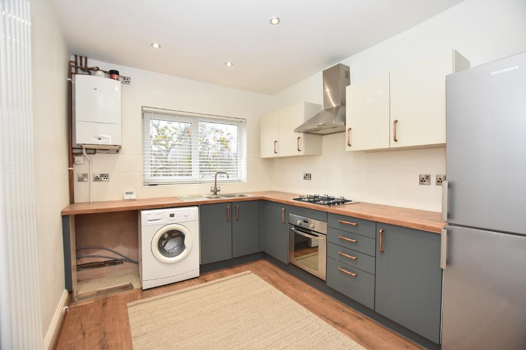 KITCHEN: 2.8m x 3.4m (9"2" x 11"0"); with a range of two tone cream and grey wall and base units with laminate wood effect work surfaces, integrated electric oven and four ring gas hob with stainless steel extractor hood over, Plumbed and drained an automatic washing machine and external door to rear yard.
