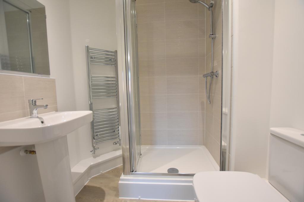 En-suite shower room: 3-piece white Roca suite comprising a low suite w.c. with push button flush, pedestal wash-hand basin with chrome mixer tap and tiled splashback, corner shower enclosure with fitted thermostatic shower, part-tiled walls, chrome heated ladder style towel rail and extractor fan.