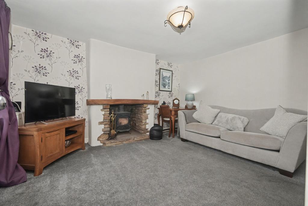 Lounge: 4.7m x 4.1m (15'5" x 13'4"); with a multi-fuel burner set on a stone hearth in stone surround with wooden mantle over. Television and telephone points, gas and electric meters. One wall light point, wooden flooring.