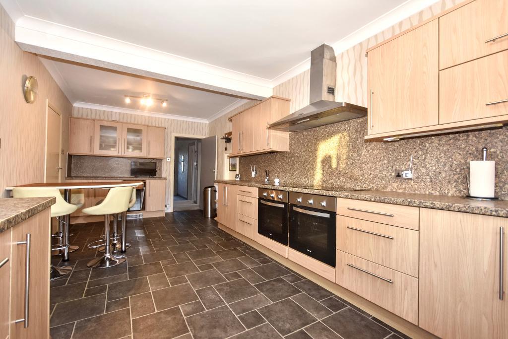 DINING KITCHEN: 22' 11'' x 9' 10'' (7m x 3m) with a range of fitted matching base and wall storage cupboards and display cabinets with complimentary working surfaces and breakfast bar, 2 built in electric ovens, 2 x 4 ring ceramic electric hobs with a large stainless steel extractor over, 1 and a half bowl stainless steel sink unit, built in dishwasher, tiled flooring, kick space heater, door to rear porch.