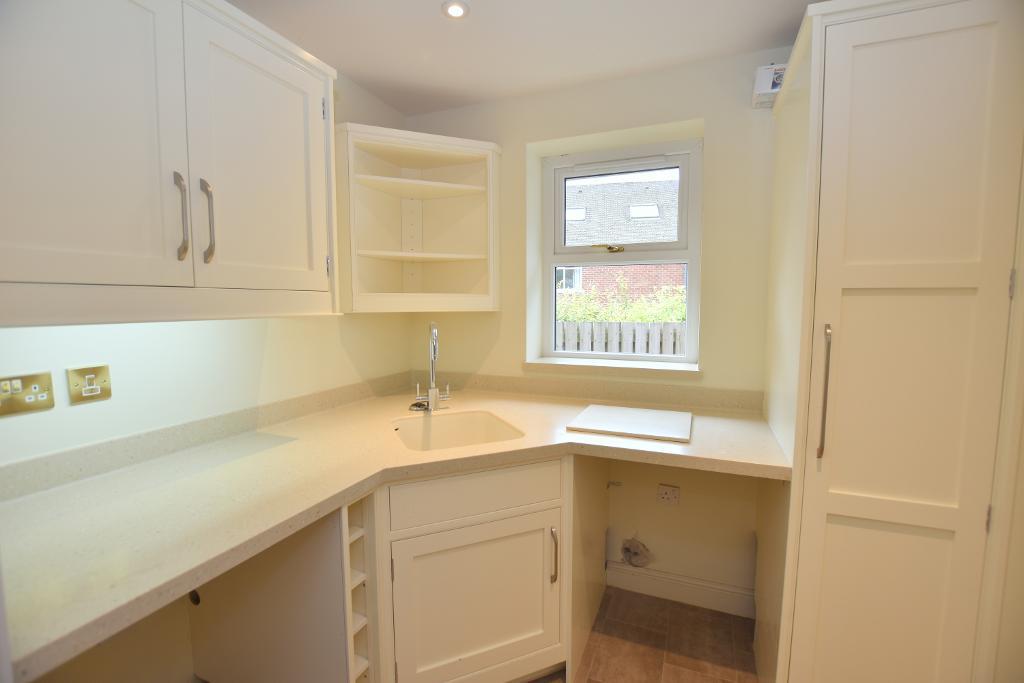 UTILITY ROOM: 7' 2'' x 6' 2'' (2.2m x 1.9m) with a fitted range of cream wall and base units with complementary Corian work surface and splashback with moulded sink and chrome mixer tap, plumbing for washing machine, space and vented for a tumble drier, larder storage cupboard and wine rack, door to integral garage and chrome heated ladder style towel rail.