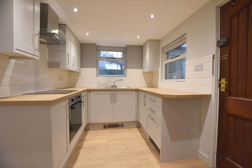 Kitchen: 2.8m x 2.3m (9'3" x 7'8"); with modern fitted grey shaker style wall and base units with complementary wood effect laminate work surface and tiled splashback, one bowl stainless steel sink unit with mixer tap, electric fan oven, 4-ring ceramic hob with glass and stainless steel extractor canopy over, space for fridge-freezer, recessed spotlighting, 2 windows and door leading to: