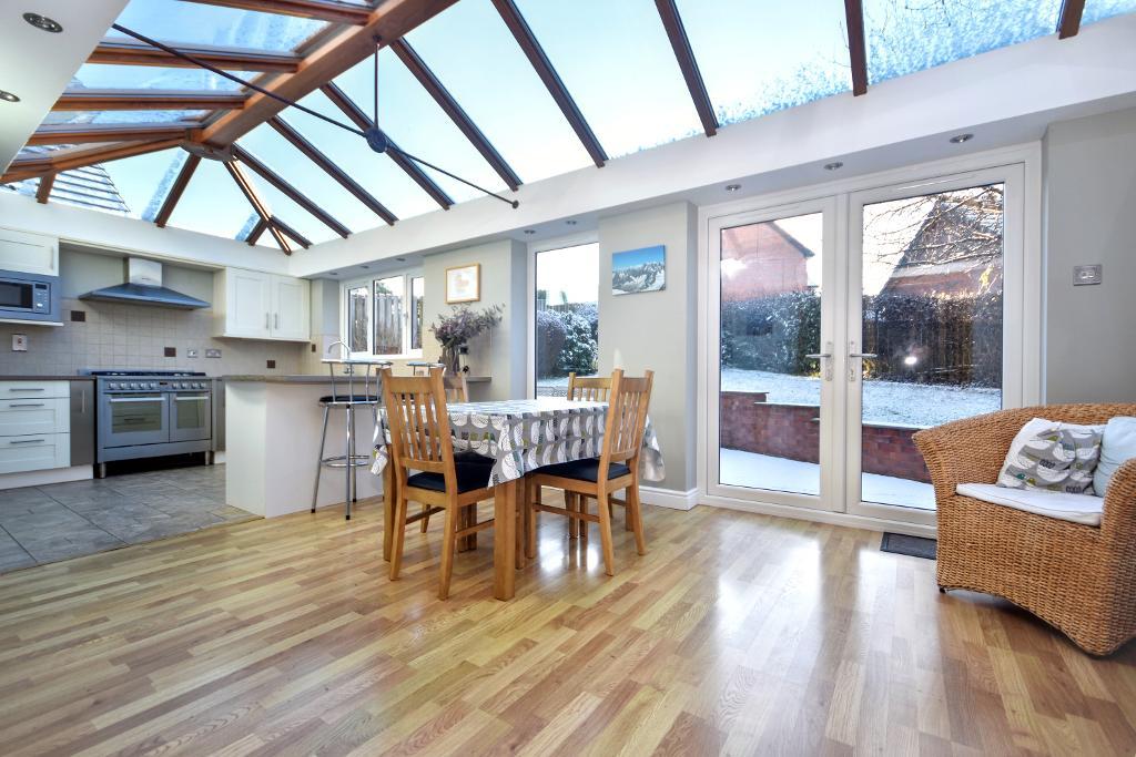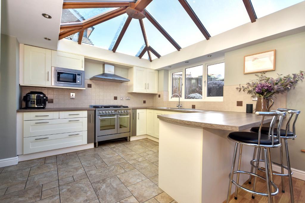 KITCHEN: 22' 7'' x 20' 8'' (6.9m x 6.3m) an L shape open plan living area and kitchen with fitted base and matching wall storage cupboards with complementary working surfaces. A range of built in appliances including: combination microwave, range cooker with a 5 ring gas hob and dual ovens, stainless steel extractor hood over, integrated large fridge and separate large freezer, washing machine and dishwasher, breakfast bar, partially tiled walls, tiled flooring, low voltage lighting, glass ceiling and side access door. Living area with laminate wood effect flooring, low voltage lighting and PVC French doors to the rear garden.