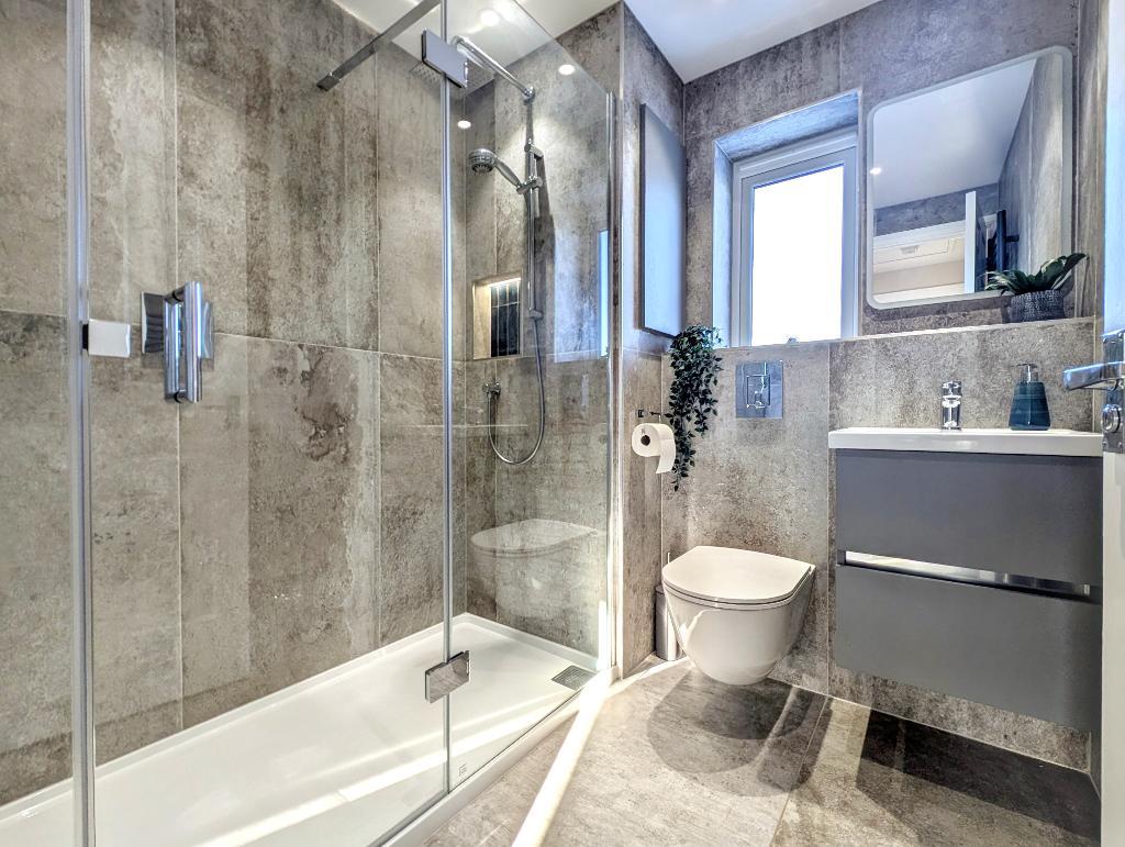 Fully tiled walls, tiled floor, low voltage lightning, extractor fan, heated stainless steel towel rail.