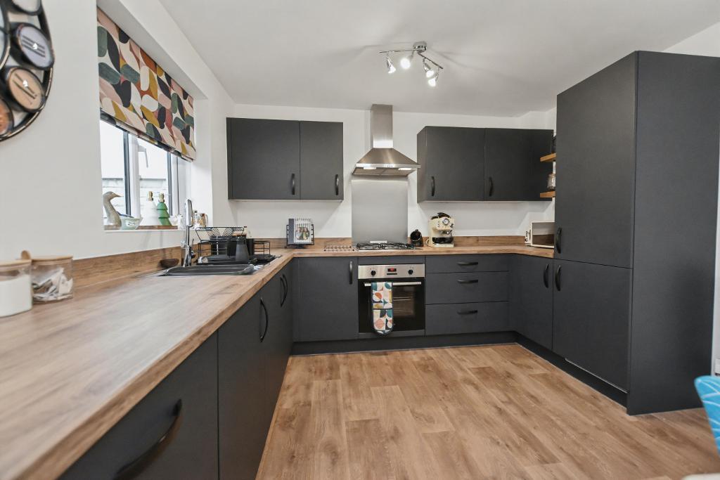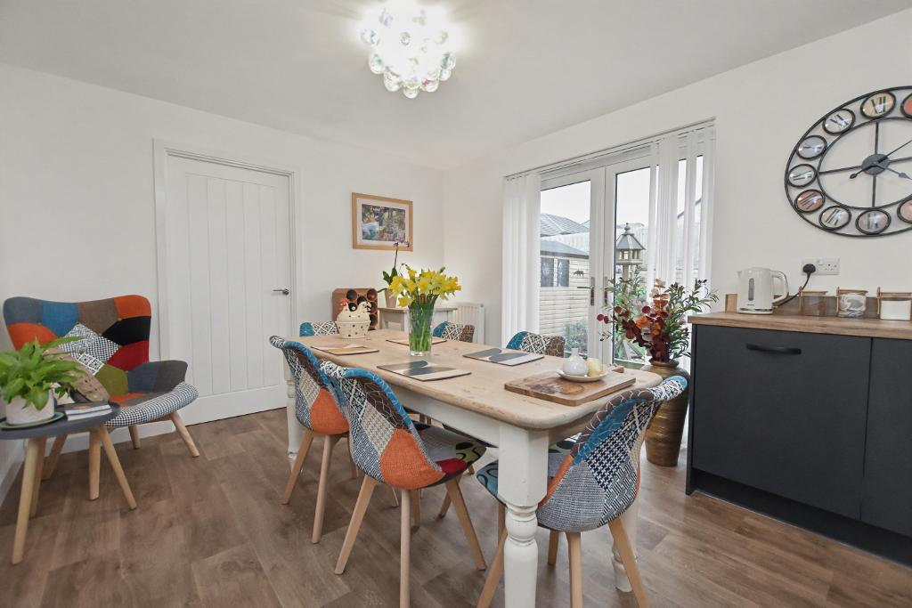 A modern detached family house situated on this enviable plot at the end of a small cul-de-sac of just 3 houses with open land to the front and side. Built in 2023 by Miller Homes this beautiful house offers bright accommodation with a hallway, lounge, large dining kitchen with French doors opening onto the garden, plus a utility room and 2-piece cloakroom. Upstairs there are 4 bedrooms, the master has an en-suite shower room and there is a 3-piece house bathroom. The cul-de-sac is block paved and leads to the tarmac driveway and garage, there are gardens to the front and side and the rear garden has been landscaped with stone pathways, lawn, circular patio and timber storage shed with power. The property is freehold and has the remainder of the 10-years guarantee. Viewing is recommended.