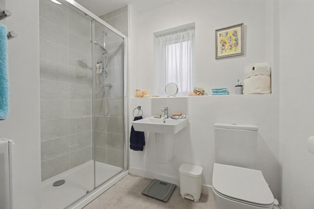 Ensuite Shower Room: 2.1m x 2.5m (6"11" x 8"4"); with 3-piece white suite comprising low suite W.C with push button flush, wall hung semi pedestal wash hand basin with chrome mixer tap, double shower enclosure with fitted thermostatic shower, part-tiled walls and extractor.