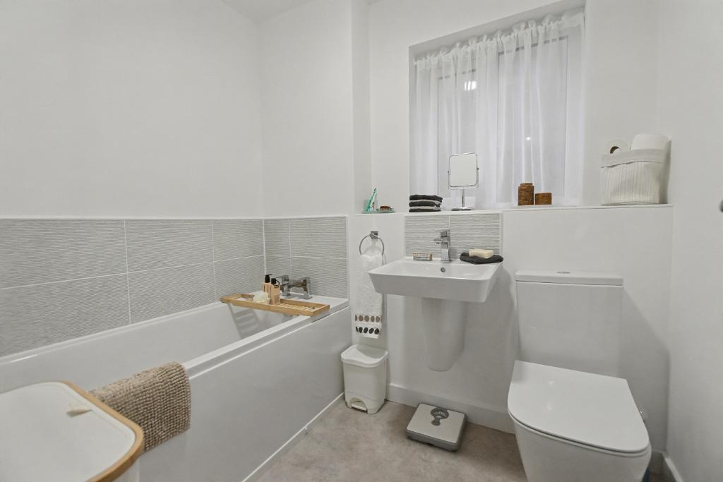 Bathroom: 2.0m x 2.2m (6"7" x 7"3"); with a 3-piece white suite comprising low suite W.C, wall hung semi pedestal wash hand basin with chrome mixer tap, panelled bath with chrome mixer tap, part tiled walls, extractor fan.