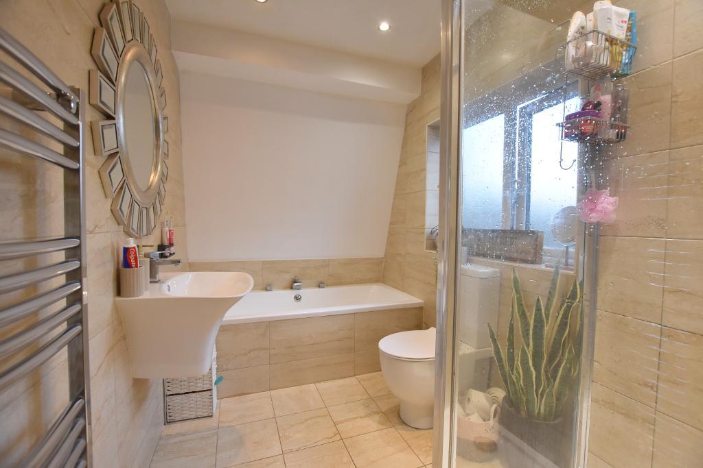 BATHROOM: Modern 4-piece suite comprising low suite w.c. with push button flush, wall hung wash handbasin with chrome mixer tap panelled bath with central chrome mixer tap, corner shower enclosure with fitted thermostatic shower with fixed shower head and separate hand held shower head, part tiled walls, tiled floor, extractor fan, recessed spotlighting, chrome heated ladder style radiator and shelving for towels.