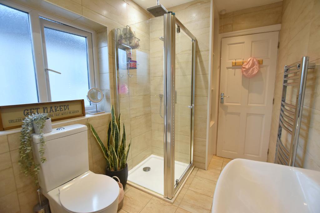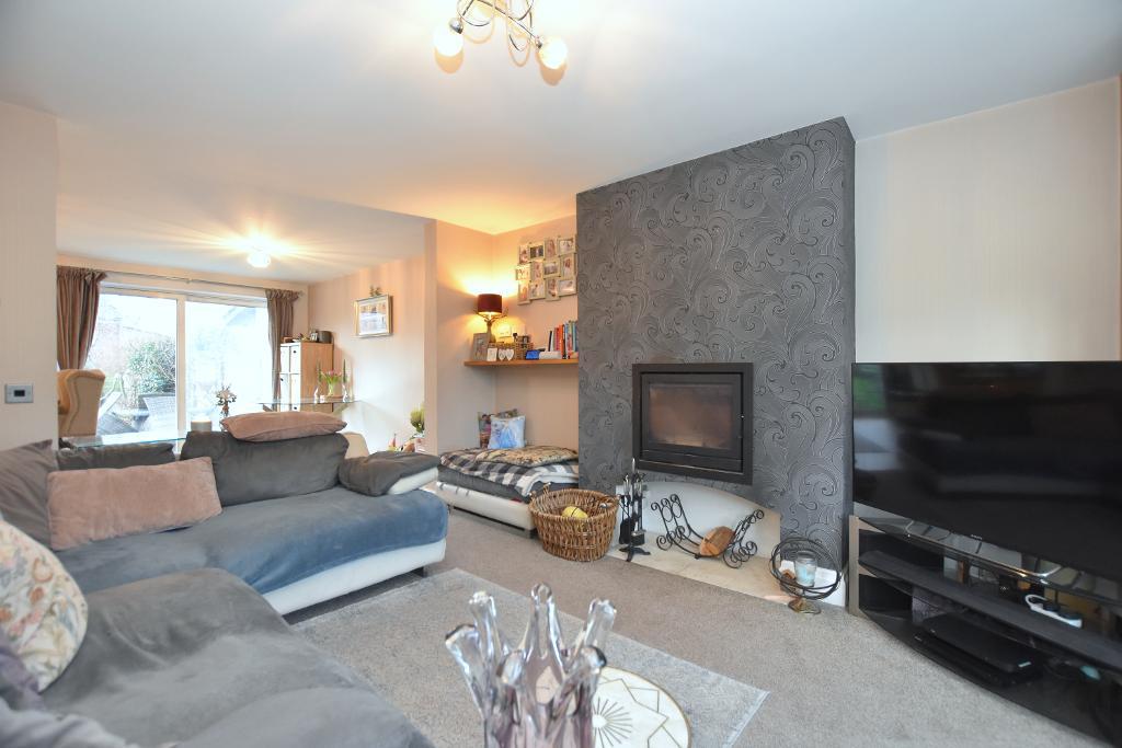 The welcoming hallway leads to a bright lounge featuring a bay window and a cosy log burner. To the rear, you"ll find an impressive open-plan dining kitchen, complete with a range of integrated appliances, breakfast bar, and patio door opening onto the garden—ideal for family living and entertaining. Upstairs, there are three well-proportioned bedrooms and a contemporary four-piece bathroom with a separate shower.