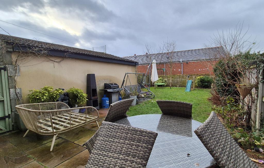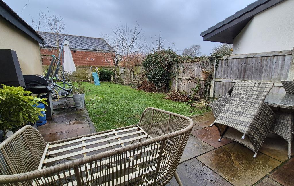 OUTSIDE: Garden to the front, concrete driveway leading to garage with up-and-over door. Enclosed rear garden with Indian stone-paved patio, lawn and planting borders.