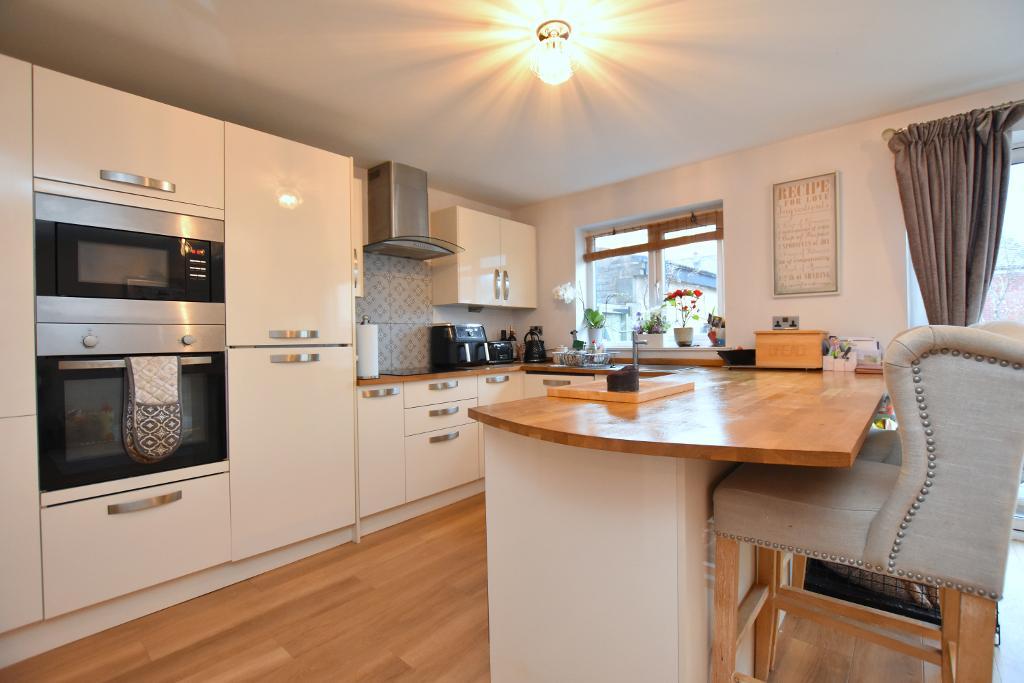 DINING KITCHEN: 5.4m x 3.7m (17"9" x 12"2") kitchen area with modern range of cream wall and base units with solid hard wood work surface and tiled splashback, stainless steel sink unit with mixer tap, Integrated electric fan oven, microwave, four ring ceramic hob with stainless steel and curved glass extractor over, integrated fridge freezer and dishwasher, central heating boiler concealed in kitchen cupboard, breakfast bar. Dining area with space for dining table and chairs, PVC patio door opening onto rear garden.