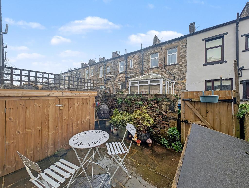 To the rear of the property is an attractive enclosed Indian stone flagged yard with two timber stores.